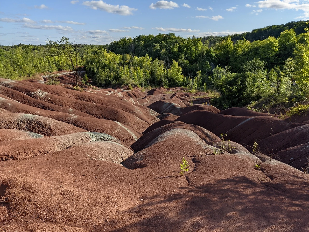 드럼헬러에서 만난 배드랜드가 남긴 강렬한 인상은 온타리오로도 이어졌다. 토론토에서 40분 정도 떨어진 칼레돈이라는 작은 도시에는 드럼헬러와는 다른 모습을 한 배드랜드가 있다. 칼레돈의 배드랜드는 드럼헬러의 배드랜드와는 달리 붉은색 퇴적암이 켜켜이 쌓인 형태를 띠고 있다. 단단해 보이는 토질과 기이하게 솟은 바위 기둥이 드럼헬러 배드랜드의 매력이었다면, 1990년에 유네스코가 세계 생물권 보존지역으로 지정한 나이아가라 절벽의 일부인 칼레돈 배드랜드의 매력은 황토 카펫을 깔아놓은 듯 부드러워 보이는 토질이었다. 사람의 발이 닫지 않도록 철저하게 보호되는 칼레돈 배드랜드 주위에 설치된 산책로를 따라 걷다 보면 누구든 낯설지만 묘하게 매력적인 그 풍경 속으로 빠져들 수밖에 없을 듯하다.