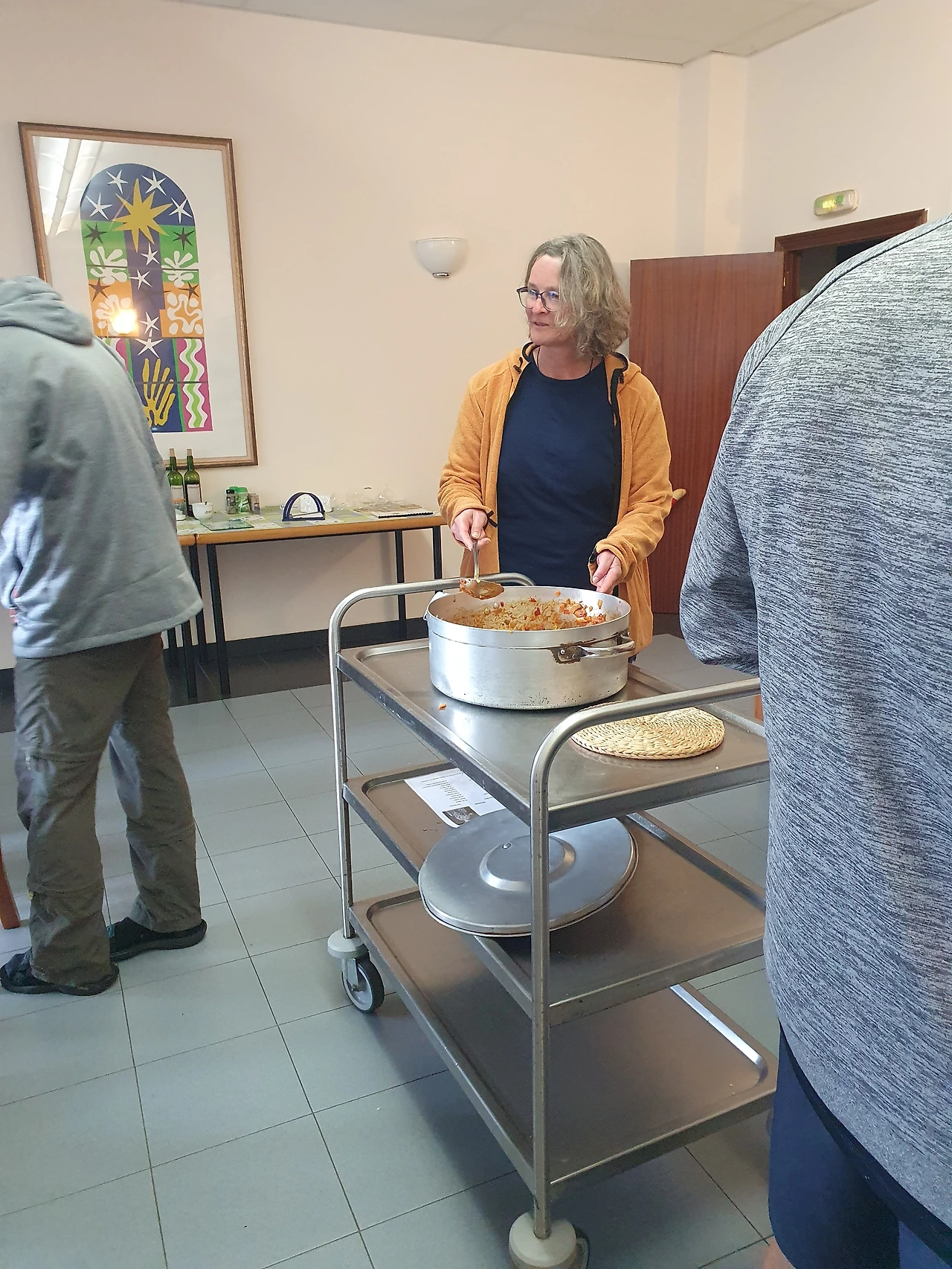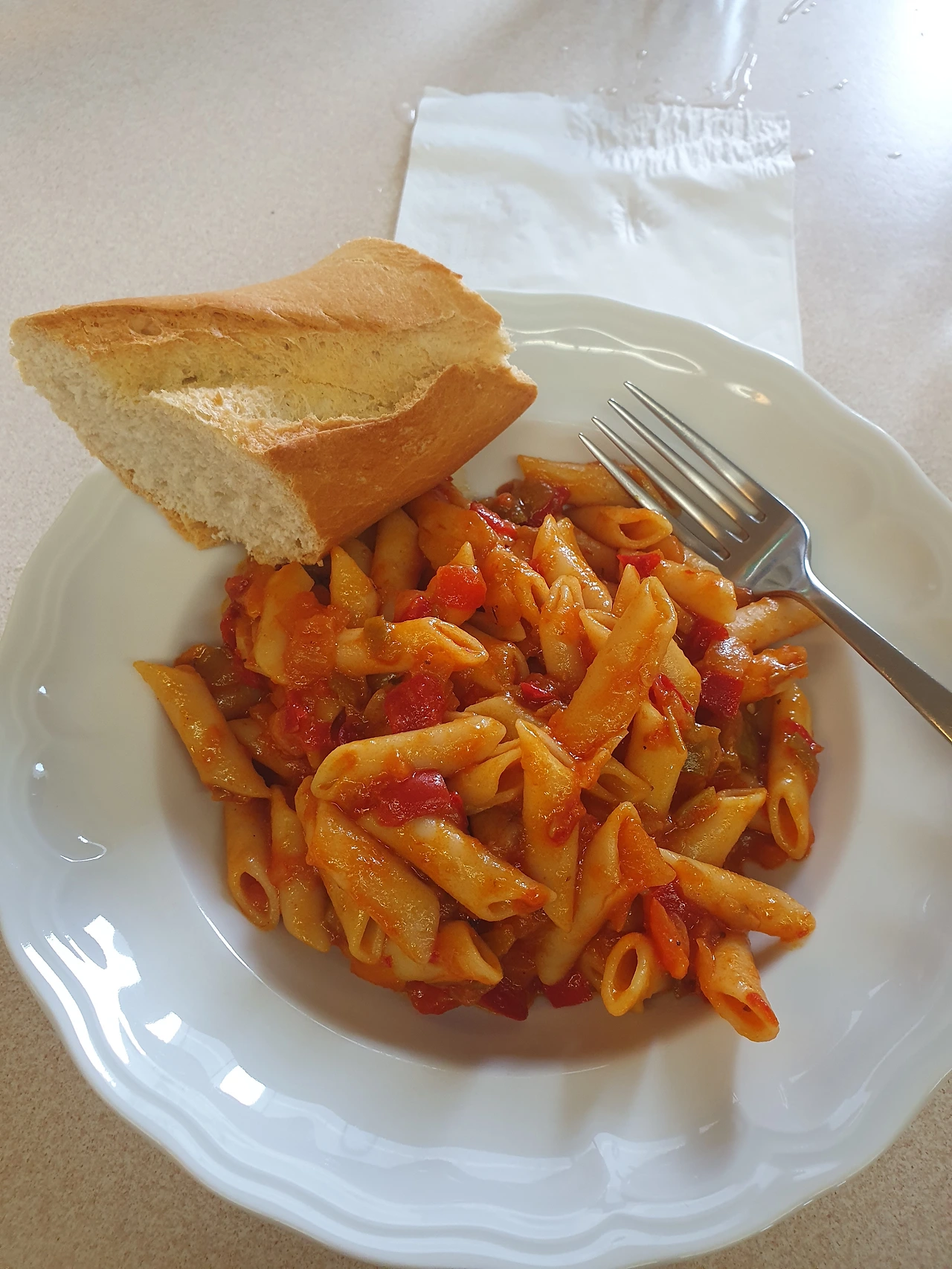 식당으로 들어가니, 좋은 냄새의 파스타와 바게트 빵이 준비되어 있었다. 그릇에 파스타를 받아 자리에 앉으니 아까 막 도착해 체크인할 때 나보다 먼저 온 젊은이가 식탁 앞에 앉아 있었다. 체크인할 때 우리나라 편의점 의자 같은 빨간 플라스틱 의자에 앉아서 책을 읽고 있었던 청년. 내가 빨래를 하고 있을 때 어떻게 빨래를 했는지 물어보며 네덜란드에서 왔다고 자기소개를 했었다. 저녁을 먹으며 본인이 아시아에 한국 빼고는 여러 군데 다녀왔다는 것, 이룬에서 여자친구와 산티아고를 같이 출발했는데 각자 본인의 산티아고를 걷기로 하고 지금은 따로 걷고 있다는 것, 곧 30살이 되어가는데 제법 괜찮은 직장을 다니다 지금은 잠시 쉬고 있다는 것, 그리고 일본, 태국, 대만 등 아시아를 여행 다녔으며, 한국 또한 가고 싶었지만 아직까진 버킷리스트에 있다는 점 등등 주로 여행에 대한 이야기를 나누었다.