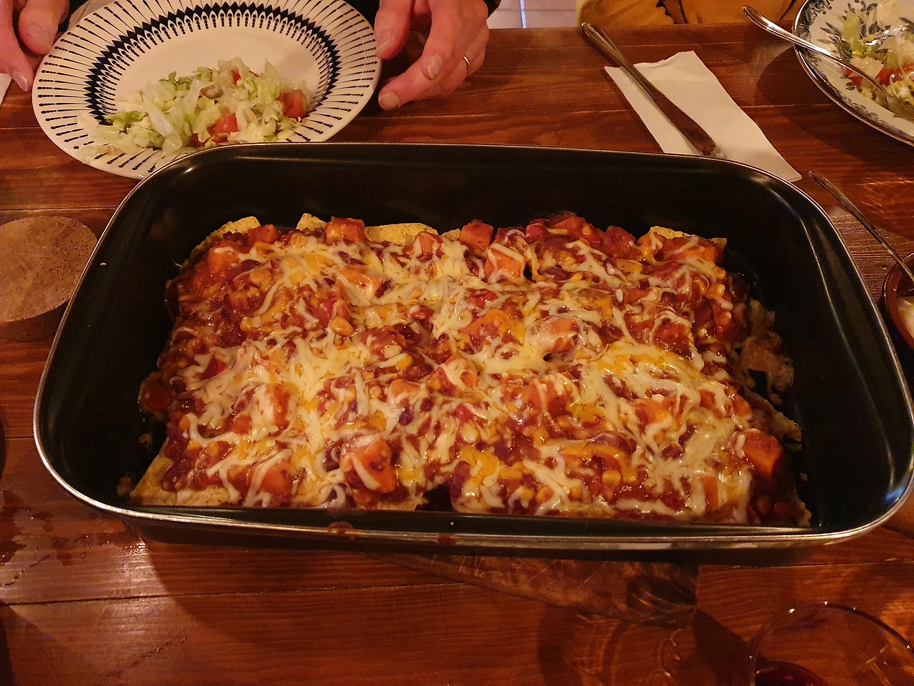 당근 수프와 콩과 채소가 들어간 치즈 나초