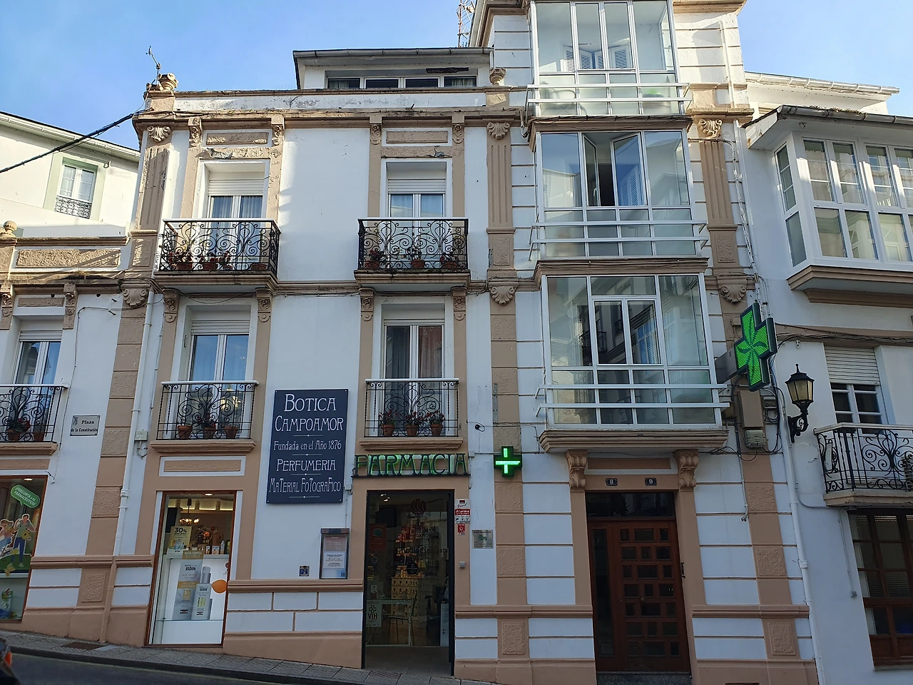 Navia 시내와 오래된 멋스런 건물의 약국