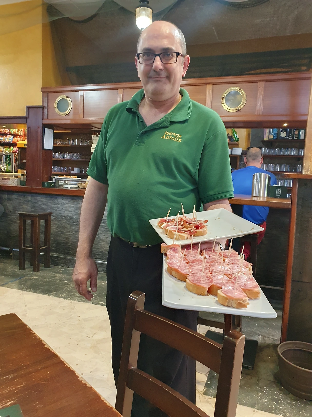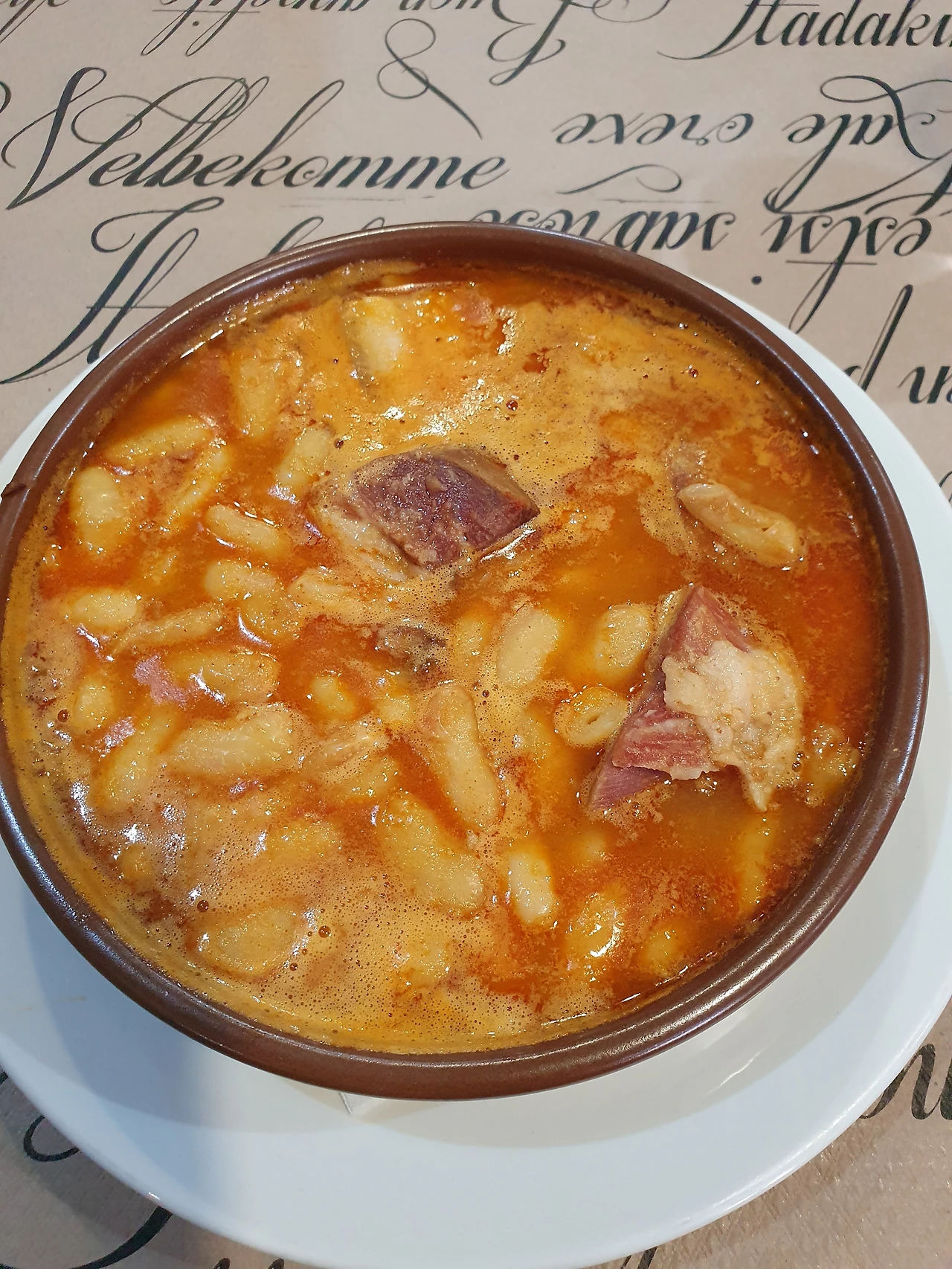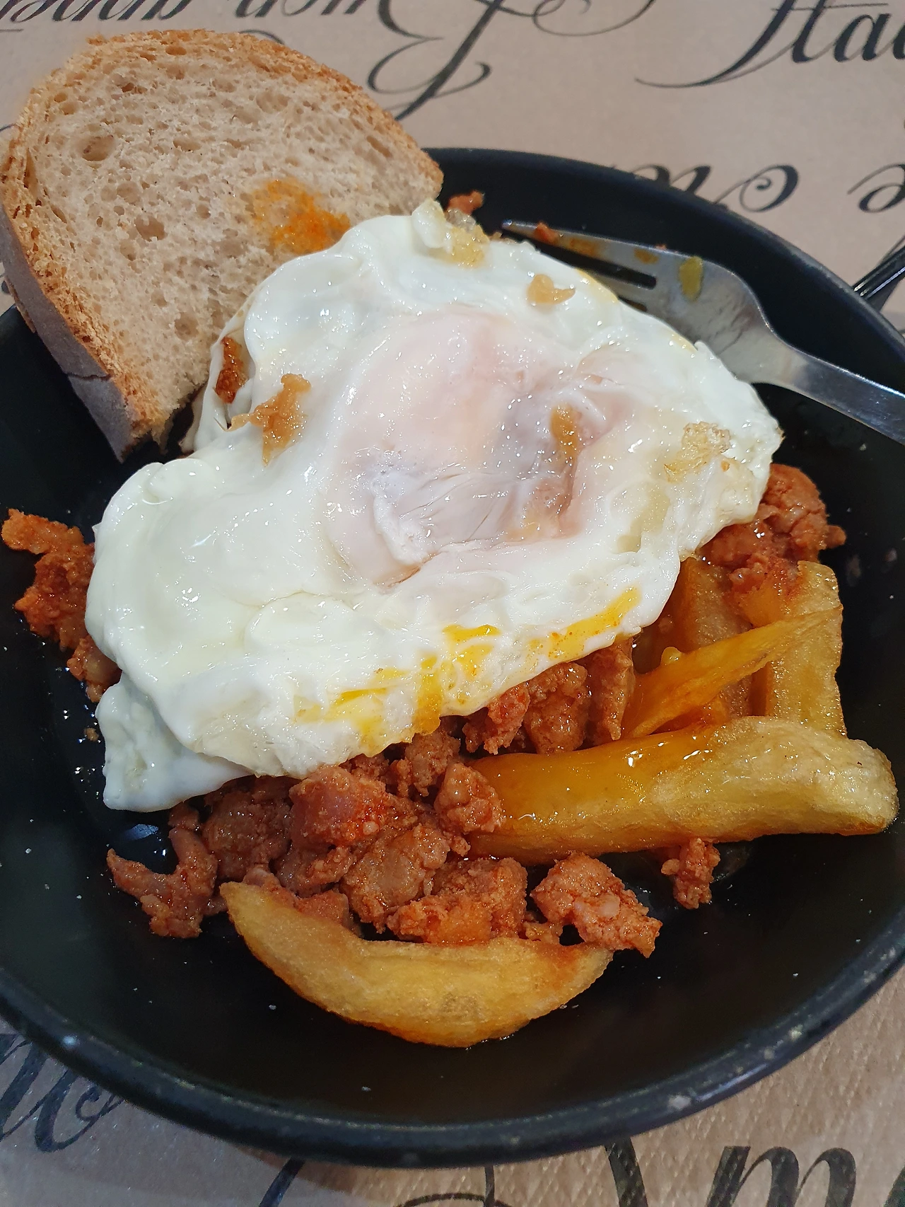 식당에 들어간 시간이 저녁 7시 40분이었는데, 시간을 기억하는 이유는 저녁 메뉴는 8시부터 주문이 가능하다고 했기 때문에 20분은 와인을 마시며 기다렸기 때문이다. 기다리는 동안 종업원은 두 번이나 스낵!이라고 하시며 하몽을 얹은 작은 바게트, 치즈를 얹은 작은 바게트를 주시고, 8시가 되어 메뉴를 시키자 작은 그릇에 다시 한번 스낵!이라고 외치며 우리나라의 다진 돼지고기에 주물럭 양념한 것 같은 음식에 계란 프라이, 프렌치프라이 조금 담긴 식전 간식을 주셔서 메뉴가 나오기도 전에 배가 부르게 되었다.