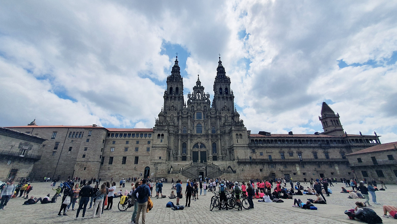 그래서 저녁에 다시 와보기로 하고 미련을 가득 품은 채 대성당 광장으로 왔다. 광장을 가로질러 대성당이 한 폭에 담길 수 있는 구도로 사진을 찍고, 광장에 앉아 순례길 완주를 만끽하는 순례자들을 모습을 찍었다. 성당은 매우 커서 얄팍한 휴대폰으로 한 모습을 담는 것은 조금 어렵다.