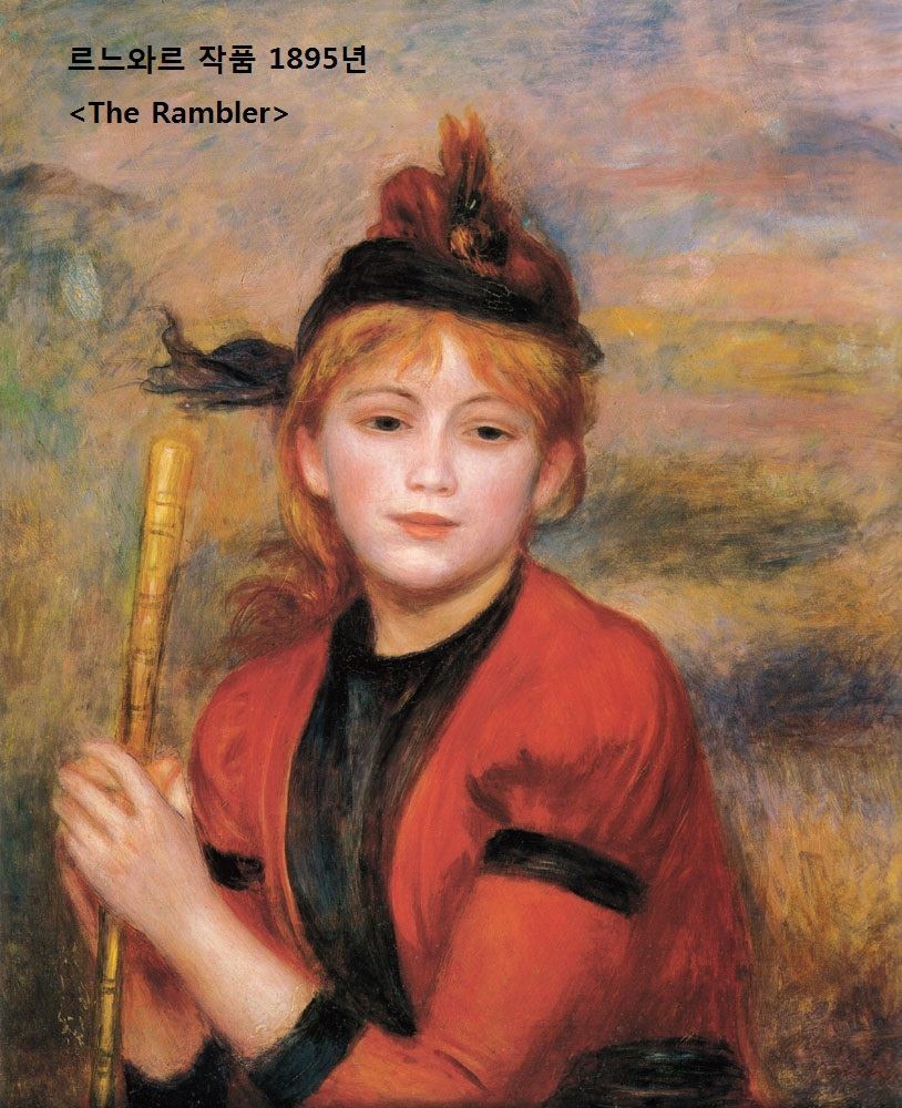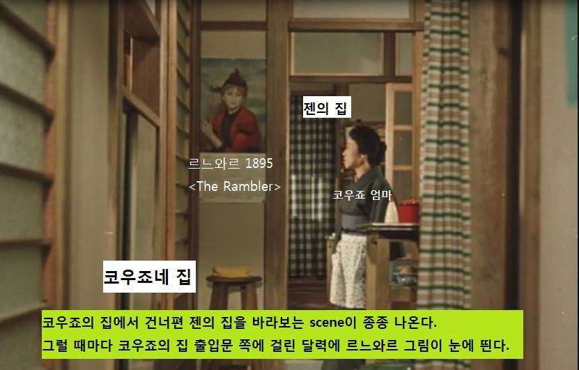 영화에서 그냥 지나칠 수 없는 자주 눈에 띄는 장면이 있다. 영화 속 마을은 집이 동시에 지어졌다는 것을 알 수 있다. 똑같은 모양과 구조의 집이 구획선에 맞춰 나란히 줄을 섰다. 워낙 가까이 붙어 있어서 이웃집 소리가 다 들릴만하다. 그런데 유독 코우죠 집에서 젠의 집을 바라보는 카메라 워크가 있다. 그때 코우죠 집 출입문 왼쪽에 누구나 볼 수 있는 위치와 크기로 달력이 걸려있다. 달력에는 르느와르의 1895년 작 <The Rambler>가 커다랗게 들어있다. 이 장면이 대여섯 번 나온다.