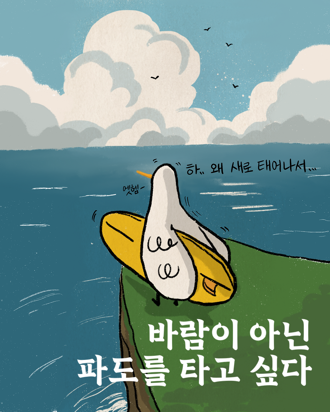 슬프지만 그래도 아직 꿈을 꾸고 있다. 누군가는 새가 바람을 타고 나는 것을 부러워할 수 있지만, 파도 타는 것을 원하는 새도 있을 수 있지 않을까? 나는 그게 나일 수 있다고 생각한다. 파토를 타고 싶은 새, 새롭게 살고 싶은 나.