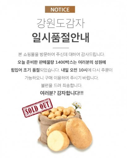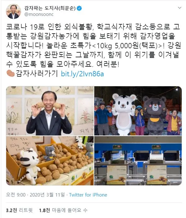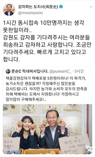 1. [감자 파는 도지사]. 코로나 19로 소비가 움츠러들자 강원도 감자를 살리겠다고 최문순 도지사가 나섰다. 트위터로 감자를 사달라는 메시지를 올린 지 얼마 안돼 나선 지 몇 시간 만에 완판됐다. 10Kg에 5000원이라는 파격적인 금액에 더불어, 코로나 19로 인한 피해를 최소화자는 국민들의 마음, 그리고 도지사가 트위터로 감자를 판다는 재미 요소가 결합되며, 첫날에도 둘째 날에도 계속 서버가 터질 정도로 높은 인기를 기록했다. 포케팅(포테이토+티케팅)이라는 신조어도 만들어냈다.