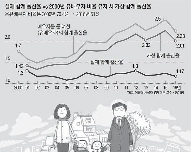 합계출산율은 15세부터 49세까지 가임기 여성 전체가 낳을 것으로 기대되는 아이 수의 평균을 말한다. 청년들의 취업난과 주택 가격 폭등은 초혼 연령을 늦추고 있다. 결혼이 늦어질수록 가임기가 정해져 있는 여성의 출산은 자연스레 줄어들 수 밖에 없다. 최근 불고 있는 비혼 바람도 출산율을 악화시키고 있다. 지금껏 정부의 저출산 정책은 출산 후에 여성이 겪는 문제 해결에 초점이 맞춰져 있었다. 잘못된 진단에 잘못된 처방이 나온 것이다.