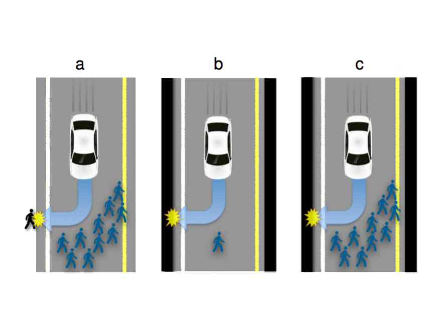 자율주행차가 아래 그림과 같은 예상치 못한 사고 상황에 직면했다. 자율주행 프로그램은 어떤 선택을 해야 하는가. 다수와 소수의 보행자 중 공리주의적인 판단에 의해 소수를 희생시켜야 하는가. 운전자와 보행자 중 누구를 희생시킬 것인가. 다수의 보행자를 살리기 위해 한명의 운전자를 희생시킬 수 있는가. 유명한 트롤리 딜레마다. 지금껏 운전자의 도덕적 판단에 맡겨졌던 사고 상황에서의 순간적 결정은 이제 기계 행동의 표준화를 두고 딜레마에 빠졌다.