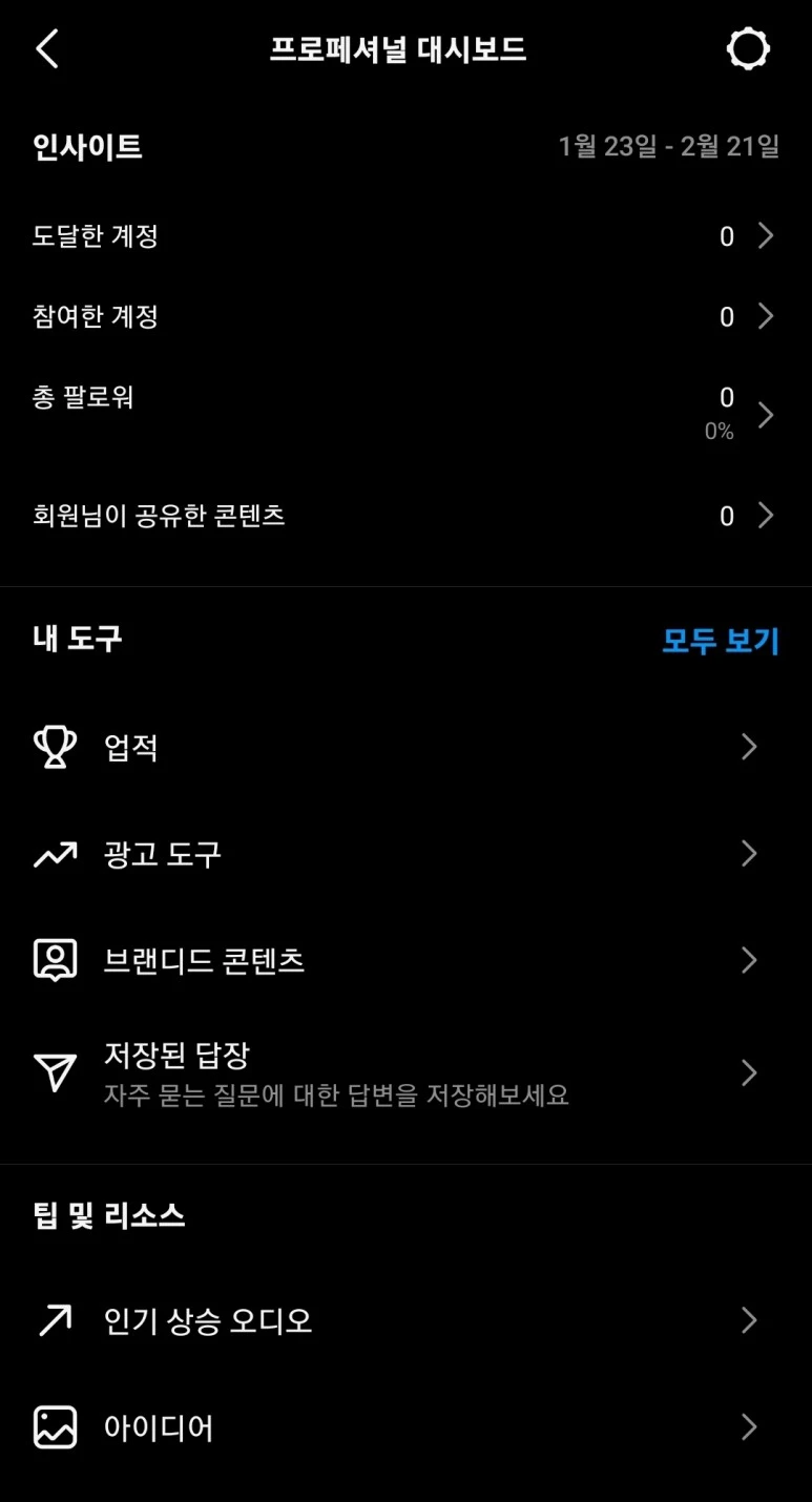 프로페셔널 대시보드 버튼을 누르면 인스타그램 항목에 대한 상세 정보들이 나열되어 안내되고 있다.