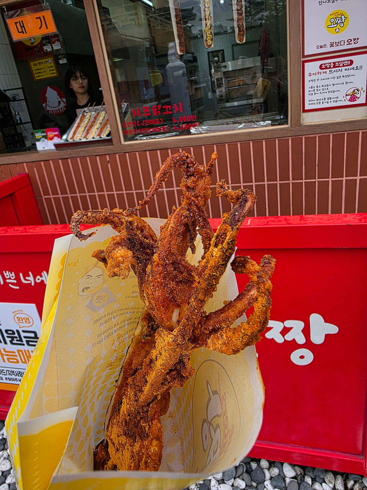 추억의 맛을 기다리며, 실망할까 미리 혼자 중얼거렸다. 조금 시간이 지나고 오징어튀김을 받아 들었을때, 비주얼이 워낙 별로라 크게 기대하지 않았다. 하지만 한입 베어 문 순간, 나의 의심은 확신으로 바뀌었다. 그렇지! 바로 이맛이다. 7년 전 전주에서 먹었던 바로 그 맛이었다. 가게 안내문을 읽어보니 '오짱'이라는 브랜드의 오징어 튀김은 전주 한옥마을과 이곳밖에 없는 모양이었다. 너무 맛있어서 한번 더 사먹을 정도였다. 비싸긴 하지만 또 먹고 싶다. 언제든 다시 14,000원을 지불할 용의가 있다.