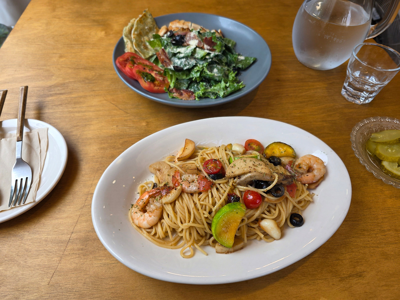 내부 풍경이 꽤나 잘 정돈된 음식점이었다. 점심시간이 아니었기에 자리는 넉넉했다. 여행가면 먹고 싶은것을 다 먹어보자는 주의라 파스타 하나와 샐러드 하나를 주문했다. 크게 기대하지 않아서 일까? 내 예상보다 훨씬 맛있어서 깜짝 놀라며 하나하나 포크로 콕콕 찍어 먹었다. 소금맛이 느껴지는 감칠맛이었는데, 그 소금맛이 기분좋은 소금맛이라 좋았다. 근 몇년간 먹어본, 아니 내가 먹어본 파스타 중에 가장 맛있었다. 샐러드도 적당히 잘 구워진 닭에 발린 소금맛이 매우 인상적이었다. 샐러드에 버무려진 소스도 간이 딱 맞았다. 더할것도, 뺄것도 없는 마음에 쏙드는 레스토랑을 발견한 것이다. 나는 그제야 경주에게 마음의 빗장을 풀고, 화해하기로(싸운적 없음) 정했다.
