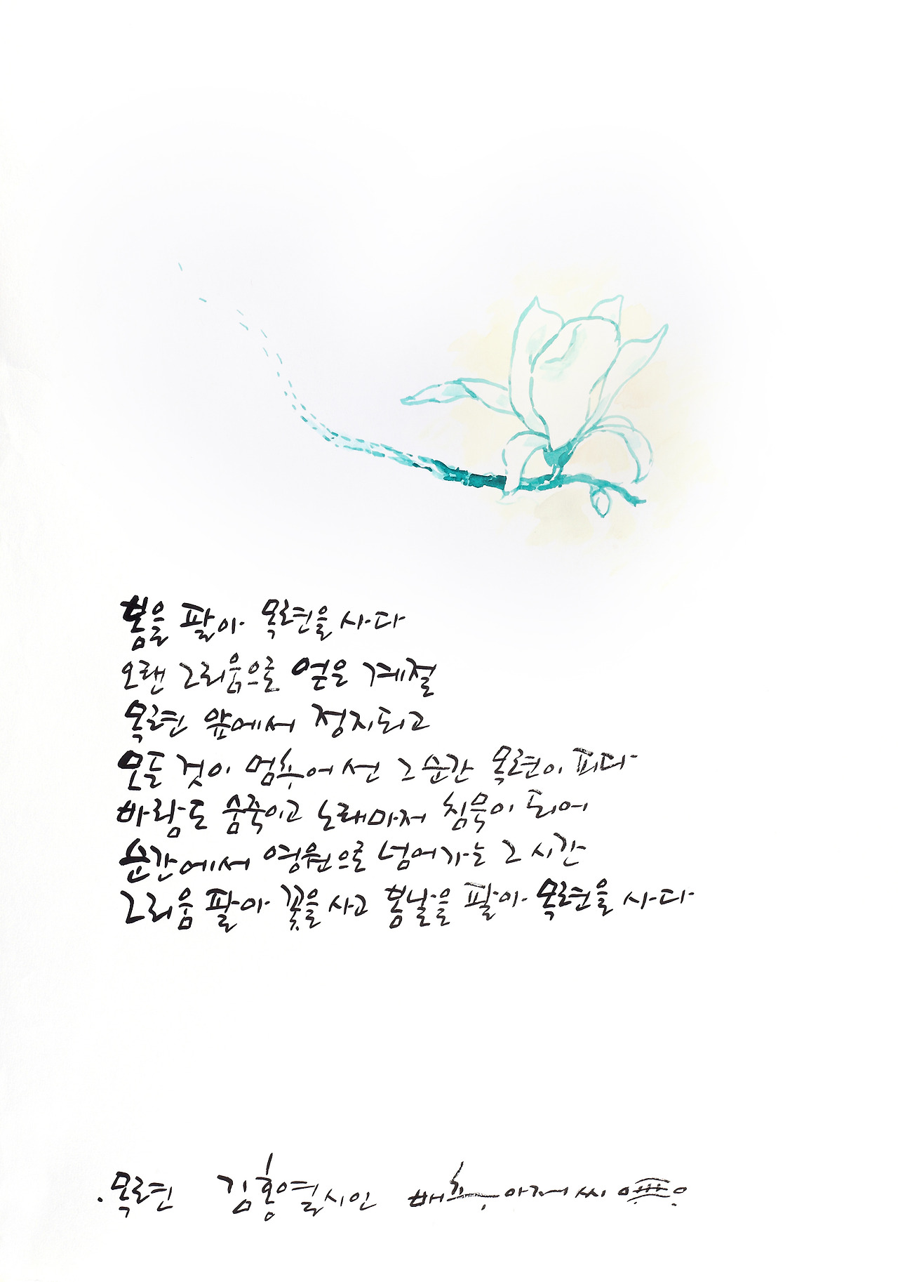 이 나르시시즘 용서하시라. 첫 연 “봄을 팔아 목련을 사다”, 이 문장 읽으면 읽을수록 가슴이 뛴다. 내가 쓴 문장 중 가장 완벽한 문장이다. 봄을 팔아야 목련을 살 수 있다. 힘든 겨울을 보내고 비로소 찾아온 생명의 환희, 다시 시작되는 새 봄의 시간들, 모든 것을 던져야만 목련 하나 피울 수 있다. 목련은 그런 꽃이다. 바람도 숨죽이고, 노래도 멈추고, 순간에서 영원으로 넘어가는 순간에 피는 꽃, 목련이다. 목련 하나 보기 위해 봄을 기다렸다. 내 봄은 목련을 위해 시작되고 목련이 피는 순간 완성됐다. ++