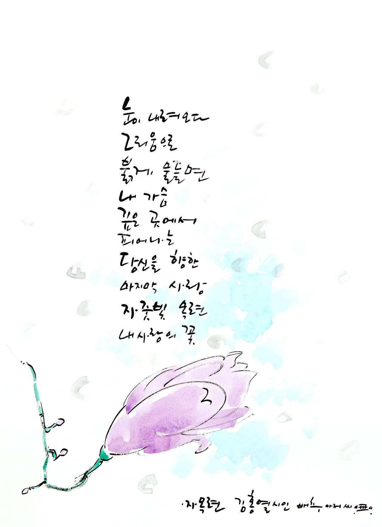 목련에는 두 개의 칼라가 있다. 순백과 정렬, 백목련과 자목련이다. 같은 목련인데 하나는 순백이고 다른 하나는 정렬의 자줏빛이다. 이 칼라 매치가 신비롭다. 자목련은 보통 백목련 다음에 핀다. 마치, 순백의 처녀가 사랑에 빠져 정렬의 댄서가 되어 라틴 음악에 몸을 맡기고 마지막 정렬을 태우는 모습 같다. 누구를 사랑했는데 고백할 수가 없었다. 사모의 정, 당신을 향한 마지막 사랑이 내 가슴 깊은 곳에서 피어나고 있는데 이제 더는 참을 수가 없다. 내 온몸으로 고백하리라. 춤으로, 사랑으로, 열정으로 그리고 자줏빛 사랑으로.