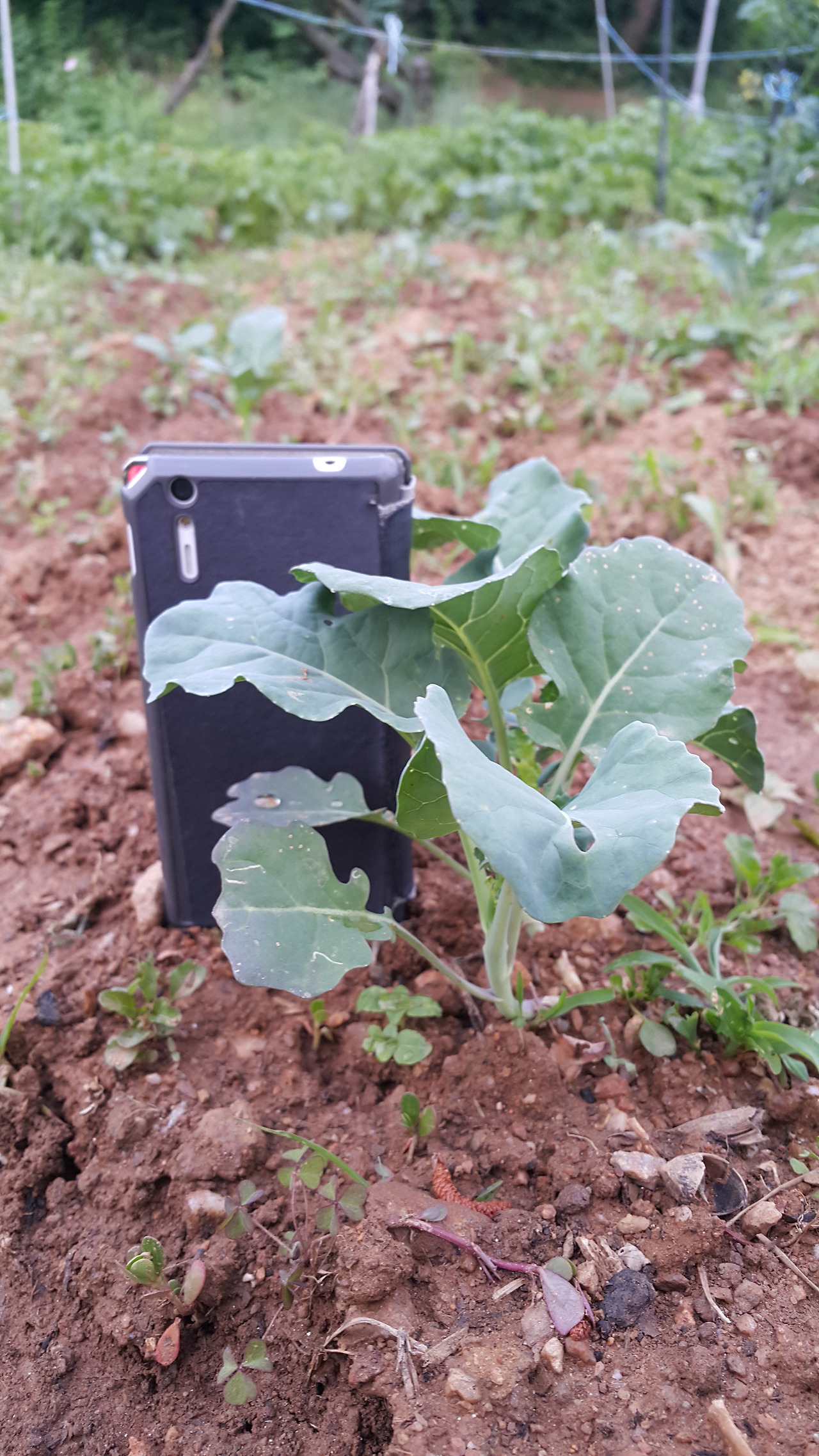 그래도 전체적으로는 잘 자라고 있어요. 대략 살펴보니 한 40포기 정도는 될 것 같습니다. 잡초가 더 빨리 자라서 잡초를 뽑아주니 브로콜리들이 잘 보이네요. 구멍 하나에 씨앗 2 ~ 3 알 정도를 심었습니다. 두 개 세 개가 올라온 곳도 있고 하나도 발아하지 못한 곳도 있습니다. 적절한 시점에 이식해서 균형을 맞출 생각입니다.