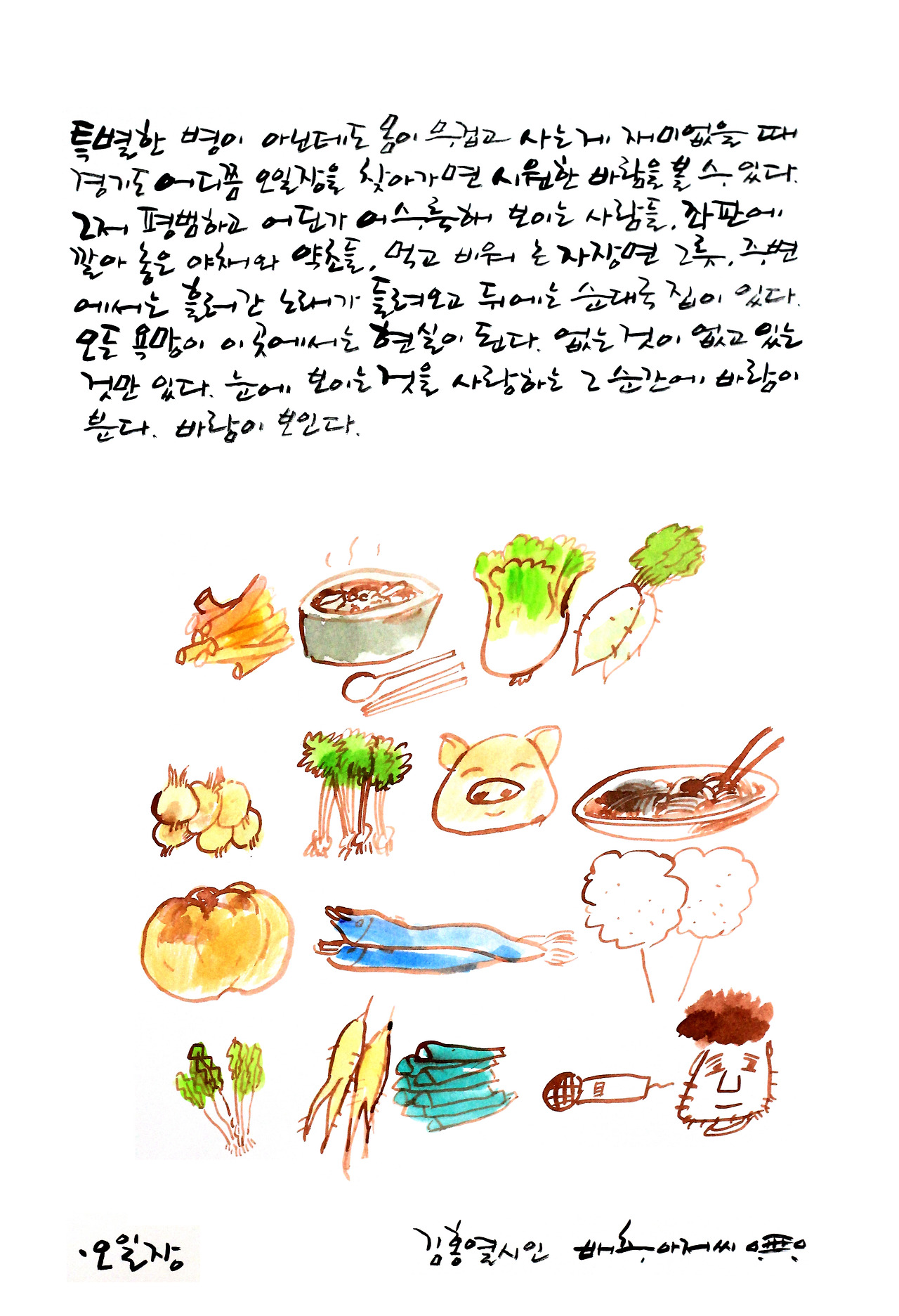 특별한 병이 아닌데도 몸이 무겁고 사는 게 재미없을 때 경기도 어디쯤 오일장을 찾아가면 시원한 바람을 볼 수 있다. 그저 평범하고 어딘가 어수룩해 보이는 사람들, 좌판에 깔아 놓은 야채와 약초들, 먹고 비워 논 자장면 그릇, 주변에서는 흘러간 노래가 들려오고. 뒤에는 순댓국 집이 있다. 모든 욕망이 이 곳에서는 현실이 된다. 없는 것이 없고 있는 것만 있다. 눈에 보이는 것을 사랑하는 그 순간에 바람이 분다. 바람이 보인다.