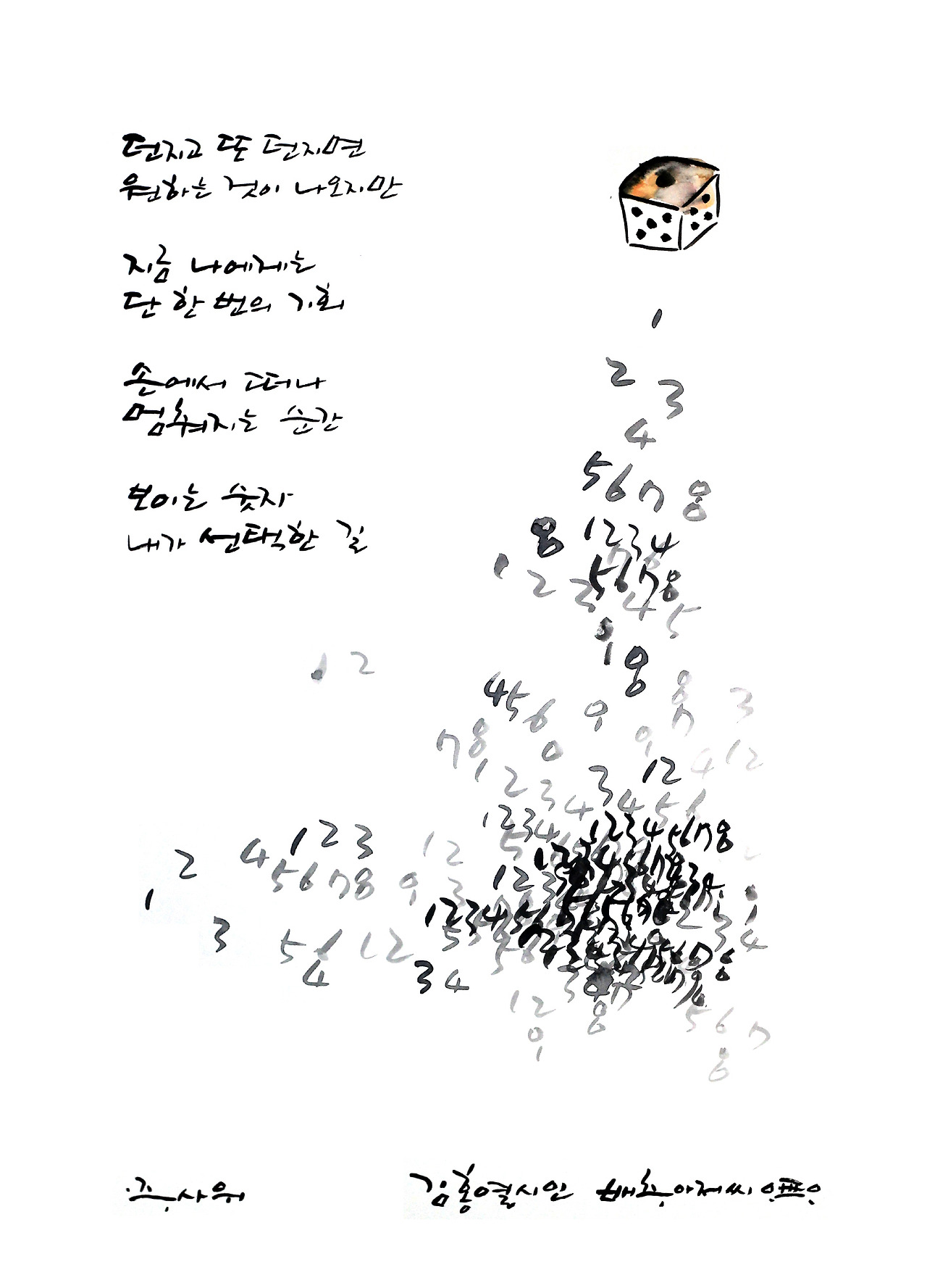 문제는 단 한 번이라는 엄연한 사실이다. 너무 많이 지체했다. 이제 던져야 하고 그 길로 떠나야 한다. 일단 던지자. 그리고 던져서 숫자가 알려주는 대로 길을 떠나자. 물론 그 길의 끝 (끝이 있을지 모르겠지만) 은 어디인지 모른다. 다만 하나, 난 던졌다. 내가 던졌다. 신이 아니라, 내가 내 주사위를 던졌다 ++
