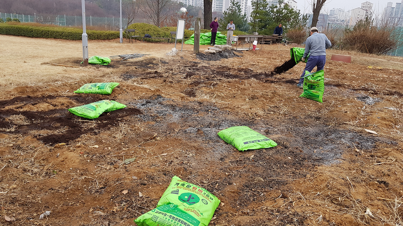이 퇴비를 땅위에 뿌린 다음 삽으로 땅을 갈아 섞어 줍니다. 일주일 후 감자부터 심으면 됩니다.