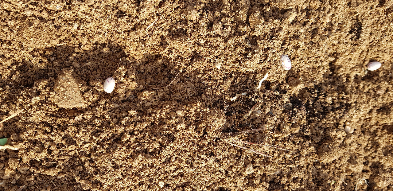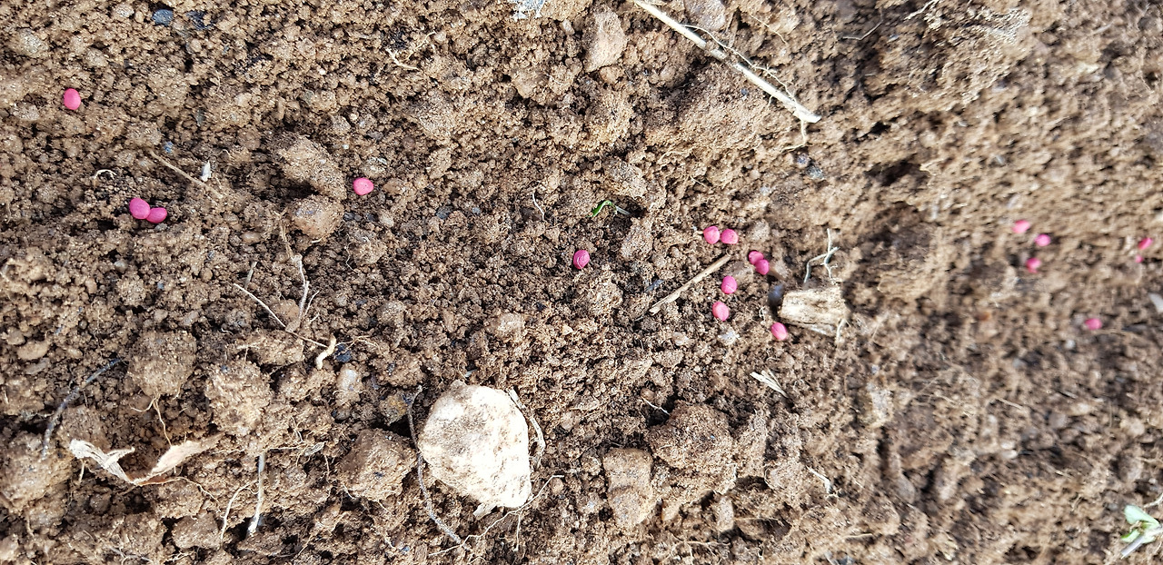 위 네 종의 봄 작물 씨앗을 땅에 뿌린 후에 찍은 사진입니다. 빨간 것이 알타리입니다. 크고 하얀 것이 강낭콩이고요.