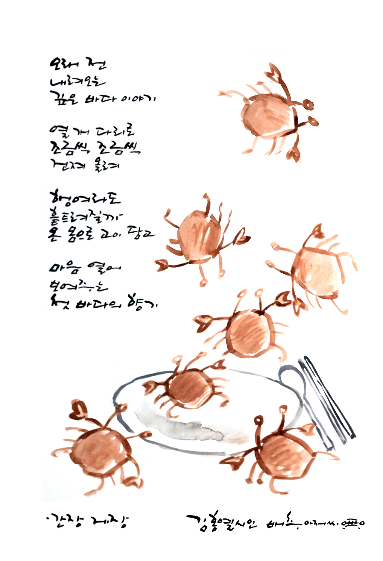 가장 좋아하는 음식이다. 농담삼아 한 마디. 간장게장이 없는 천국보다 간장게장이 있는 지옥을 선택하겠다. 둘 다 희망이 없긴 마찬가지다. 게장이 바로 희망이다. 바닷고기 회와는 다른 맛이다. 딱딱한 껍질 속에 부드러운 살이 신비롭다. 하나의 스토리를 생각한다. 깊은 바다에 창조의 신화가 숨겨져 있다. 뭍사람들에게 알려줘야 한다. 많은 어족들이 수면 위로 오르려다가 수압을 견디지 못하고 죽어버렸다. 마지막 사신이 게다. 게는 스스로 말하지 않는다. 지상의 레시피와 결합되어 사람 입안에 맴돌 때 그 맛으로 메시지를 알려준다. 맛이 향기가 된다. 시의 마지막 구절이다. 마음 열어 보여주는 첫 바다의 향기......
