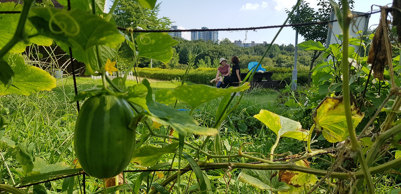 참외가 지지대를 타고 올라가 오이 옆에서 익어가고 있습니다. 저 끝에서 수다 떠는 두 여인의 모습과 잘 어울리네요.