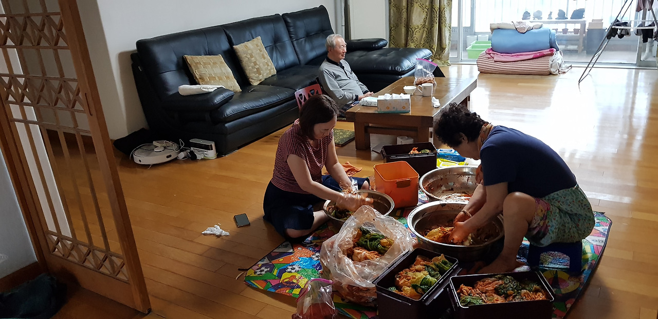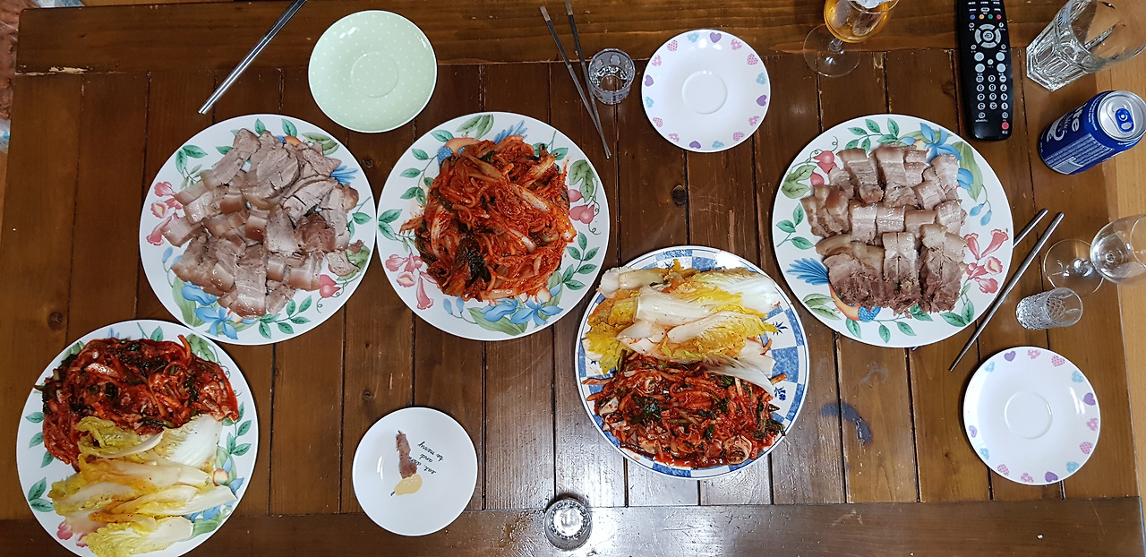 이제 김장 타임입니다. 장인 장모께서 오셔서 함께 만들었습니다. 장인어른은 나와 함께 맥주를 마시면서 입으로 김장을 했고 장모님은 아내와 함께 손으로 김장을 했습니다.