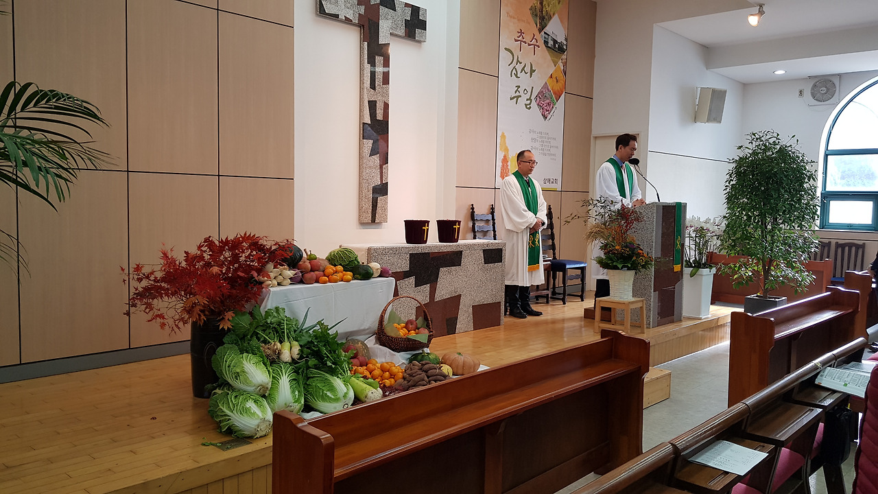 수확 다음날 추수감사절이라 교우들이 농장에서 키운 작물들로 강단을 장식했습니다. 시장에서 구매한 과일을 제외하고 모두 농장에서 가꾼 작물들입니다.
