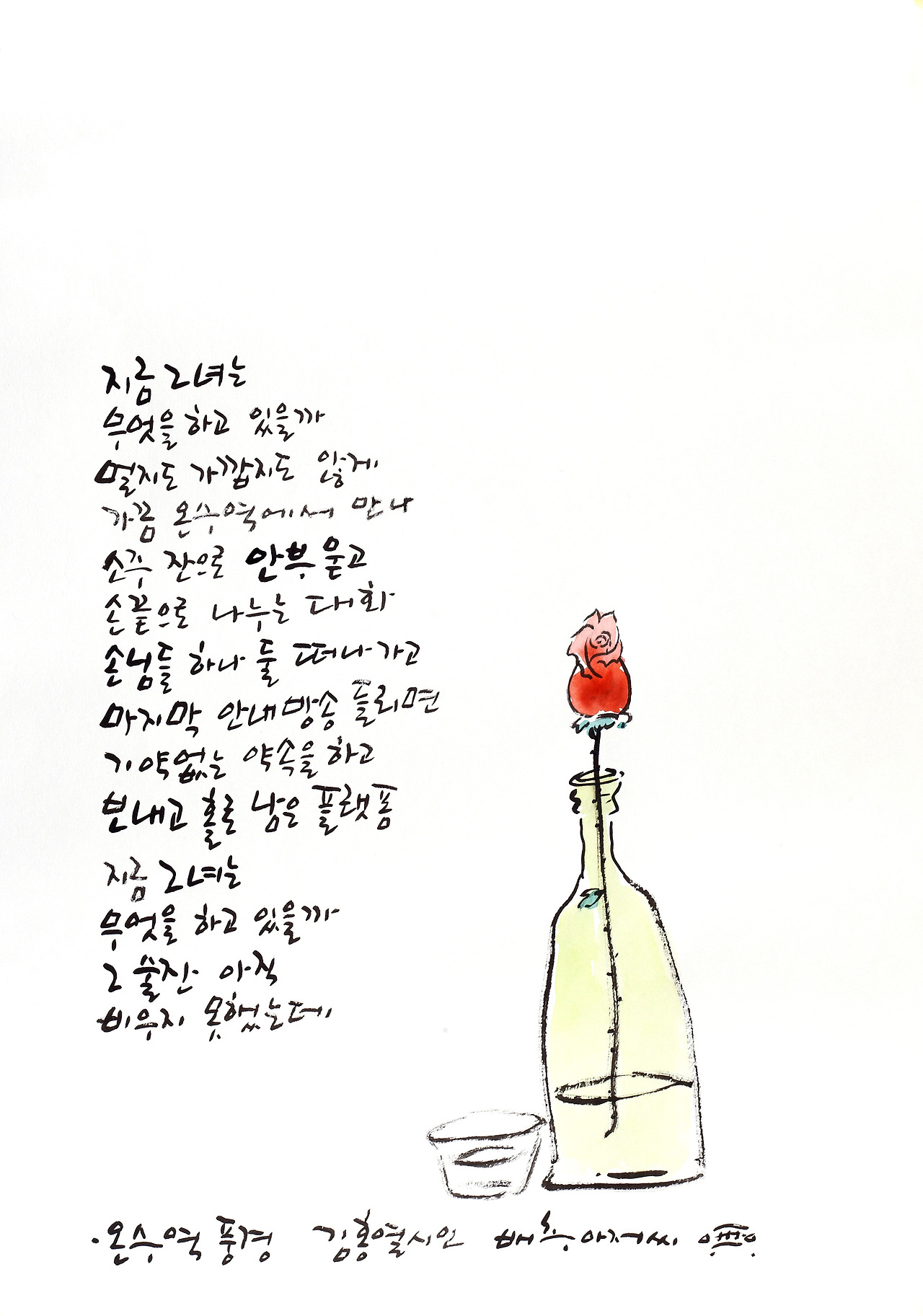 성공회대 대학원에서 사회학을 공부하면서 알게 된 특별한 장소다. 온수역은 1호선과 7호선이 만나는 교통 요지인데도 지나다니는 행인이 거의 없는 한적한 곳이다. 온수 남부역에는 일반적인 의미의 차도가 없다. 상가와 주택으로 둘러싸인 조그만 역 앞 광장만 있을 뿐이다. 이태리 소도시의 조그만 광장 같은 느낌이다. 당연히 술집도 별로 없다. 늘 가는 술집이 정해져 있다. 이제 소설을 써 본다. 어떤 연인이 있었다. 가끔 만났다. 계속 만날 수 없다는 것을 둘이 너무 잘 안다. 한 사람은 1호선을 타고 오고 다른 한 사람은 7호선을 타고 와서 늘 가는 술집에 들어가 이런저런 애틋한 이야기를 잠시 나누고 막차를 알리는 안내방송이 들리면 기약 없는 이별을 한다. 오랜 시간이 흘려 다시 이 곳 그 술집에 온다. 그때 미처 비우지 못한 술잔, 다 듣지 못한 그(녀)의 작별 인사. 지금 그녀는 무엇을 하고 있을까....