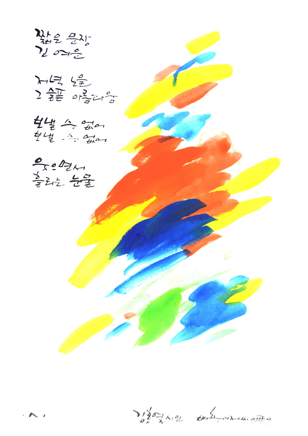 시는 짧다. 서너 단어로 긴 슬픔을 말해야 한다. 너무 슬퍼서 울음조차 안 나올 때의 그 막막함을 서너 단어로 표현해야 한다. 노을은 순식간에 지고 만다. 그지는 순간의 슬픔을 서너 단어로 나타내야 한다. 황홀한 슬픔이 두세 단어 안에 있어야 한다. 인생도 짧다. 시간은 흐르고 돌아오지 않는다. 지난 시간을 넋두리하면 안 된다. 짧고 극명하게 표현할 줄 알아야 한다. 묘비에 새겨질 단 하나의 문장, 그것이 시다. 시는 인생이다.