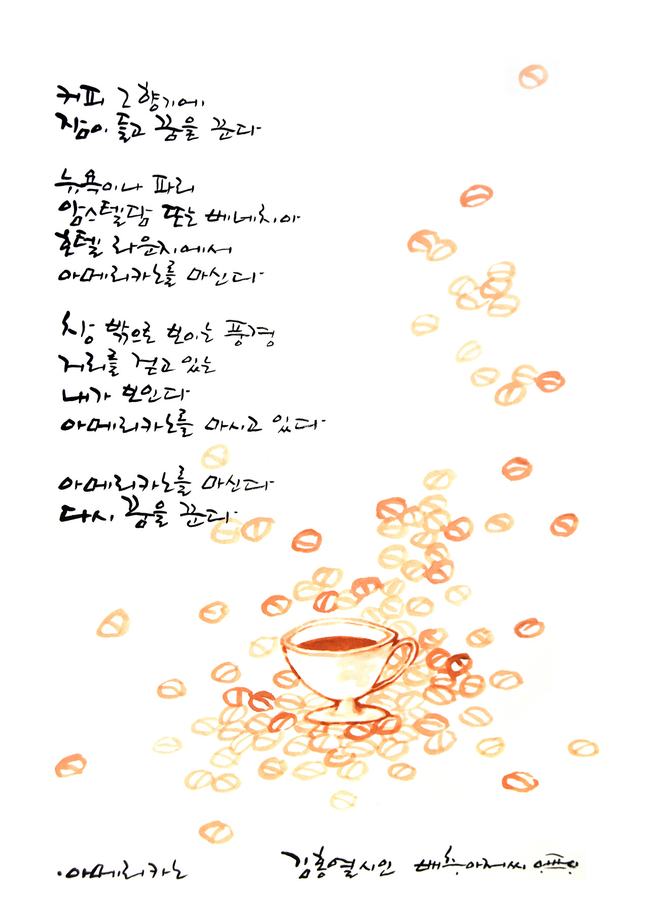 커피가 아니다. 아메리카노다. 아메리카노를 마시면 거리의 풍경이 바뀐다. 뉴욕이나 파리 암스텔담 또는 베네치아의 거리가 보인다. 낯설지 않다. 그곳에 사람들도 지금 아메리카노를 마시고 있고 나처럼 윈도 너머 거리 풍경을 보고 있다. 우리 모두 아메리카노를 마시면서 꿈을 꾼다. 현실과 몽환, 윈도 사이의 두 풍경 그리고 아메리카노가 있다.