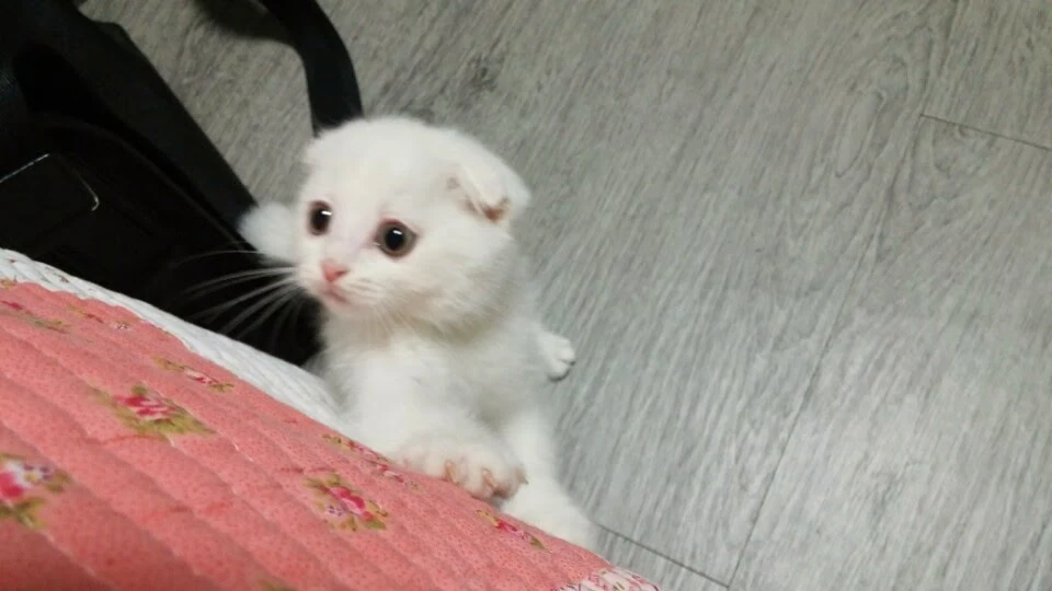 고양이를 찾아 매장 안에서 주인이 아이들을 보여준다. 하나같이 다 예쁘다. 그래서 더 고민이 된다. 고민하는 우리의 모습을 본 주인이 마지막으로 새하얀 고양이를 보여준다. 약 4개월정도 된 스코티쉬폴드였다. 온 몸이 새하얀 털로 덮여있고, 코는 연분홍색이었다. 까만 눈동자와 바찍 접힌 귀는 '날 데려가주세요'라고 호소하고 있었다. 고민할 이유가 없었다. 그 날부터 그 고양이, 겨울이는 우리와 함께하게 되었다.
