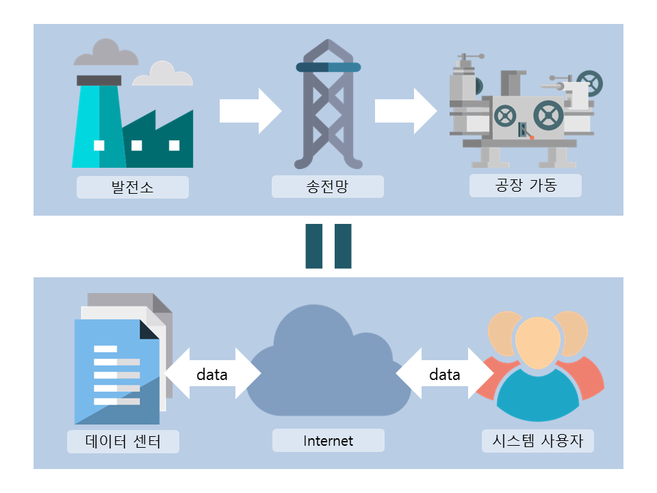 클라우드 컴퓨팅을 전력 공급 시스템에 비유해 보면 놀랍도록 맞아떨어진다. 발전소는 컴퓨팅 자원을 설치한 데이터 센터이고, 송전망은 인터넷이다. 클라우드 컴퓨팅을 사용하면, 각 회사(또는 사용자)가 데이터 센터를 소유하고 있지 않아도 된다. 데이터를 필요할 때, 필요한 만큼만 사용하면 되는 것이다. 전력과 마찬가지로 이용한 만큼 지불하는 종량 요금제이므로 초기에 큰 투자를 필요로 하지 않으며, 유연하게 사용량을 조절할 수 있다.