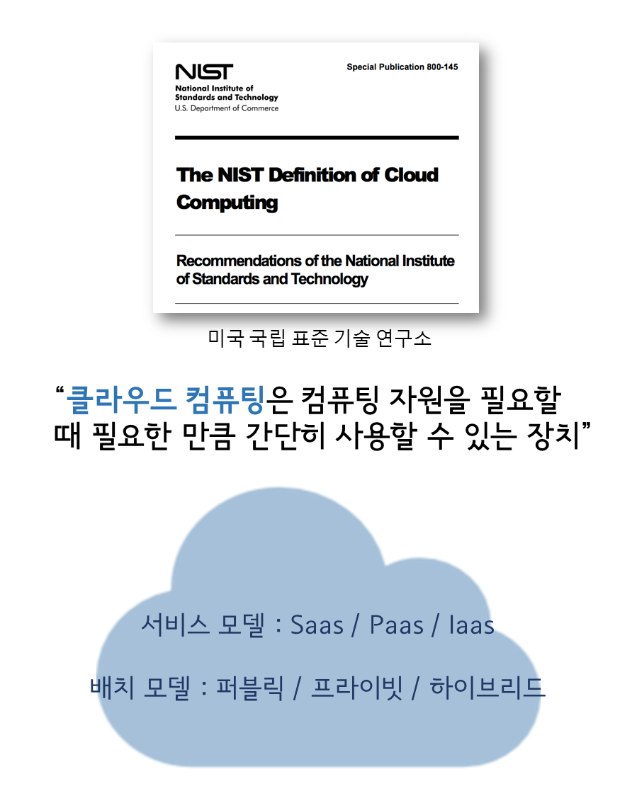 클라우드 컴퓨팅은 언제 어디서든(ubiquitous), 간편하게, 요청에 의해서 최소한의 관리 노력과 최소한의 서비스 제공자와의 상호 작용에 의해 빨리 준비되고 배포되는 설정 가능한 공유 컴퓨팅 자원(네트워크, 서버, 스토리지, 애플리케이션, 서비스) 풀에 네트워크 접근을 가능하게 하는 모델이다.
