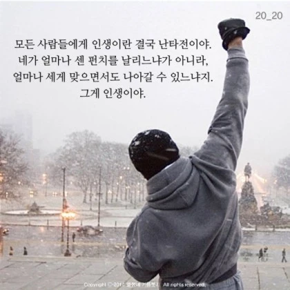 결국 '록키'가 말한 것처럼 "삶은 난타전이야. 때론 얻어맞으면서도 전진해야 해"라는 말에 공감합니다. 반드시 성공하리란 법도, 반드시 실패하리란 법도 없습니다. 그저 당신의 존재이유를 확립하고 비전의 푯대를 향해 끊임없이 시도하세요. 크고 작은 실패들이 당신을 담금질해 정금같이 나오게 할 것입니다. 도전하세요! ;)