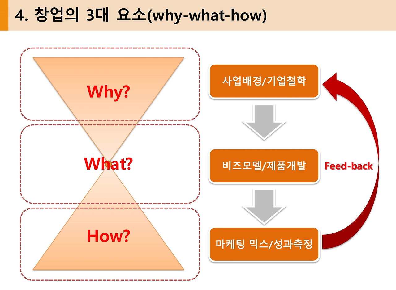창업에 있어서 창업자가 가장 신경써서 갖추고 갈러야 할 3대 요소를 꼽는다면, 나는 차라리 다음의 논리적 사고 기법을 추천한다. 그것은 바로 “Why - What - How” 3단계 기획 기법이다. 돈을 잘 벌려면 우선 일을 잘하는 ‘일잘러’가 되야한다. 만일 운이 좋아 한, 두번은 성공할 수 있을지 몰라도, 기본적인 실력이 없다면 그 성공을 결코 지속해 나갈 수 없다. 창업은 복잡한 단위업무가 얽혀있는 종합적인 업무라고 볼 수 있다. 복잡한 일을 잘하기 위해서는 여러가지 정보들을 빠르게 취합해 의사판단 및 행동계획을 세울 수 있어야 한다. 그 일을 계속 반복해 성과가 우상향한다면 창업은 궤도에 오를 것이다.