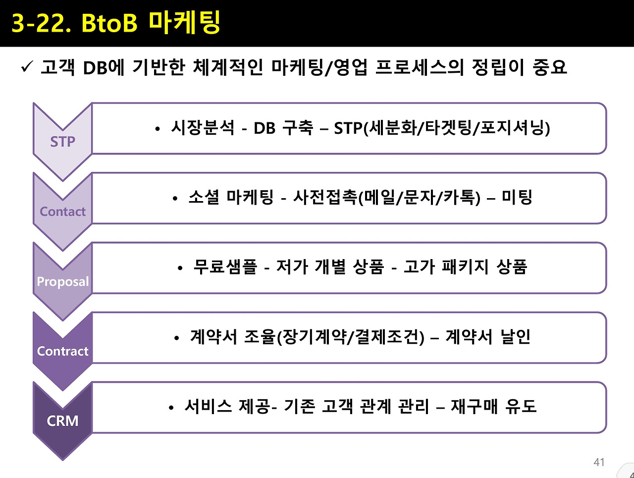 아래 그림에 제가 사용하는 ‘B2B 마케팅’을 도식화해 놓았습니다. 5단계로 나누어 보았는데, 모든 단계가 다 중요하지만 가장 중요한 것은 역시 ‘제안’과 ‘계약’ 단계입니다. 컨택 이후에 고객에 대해 충분히 숙지하고 연구한 후, 어떤 포인트의 제안을 던져서 계약으로 이끌 것인지에 대한 충분한 작전들이 필요합니다. 여기에는 많은 시행착오들을 통한 경험이 필요하지만, 우선 다른 사람들의 이론과 사례들을 공부하며 시장에 대해 파악한 후 부딪힌다면 분명 도움이 될 것 입니다.