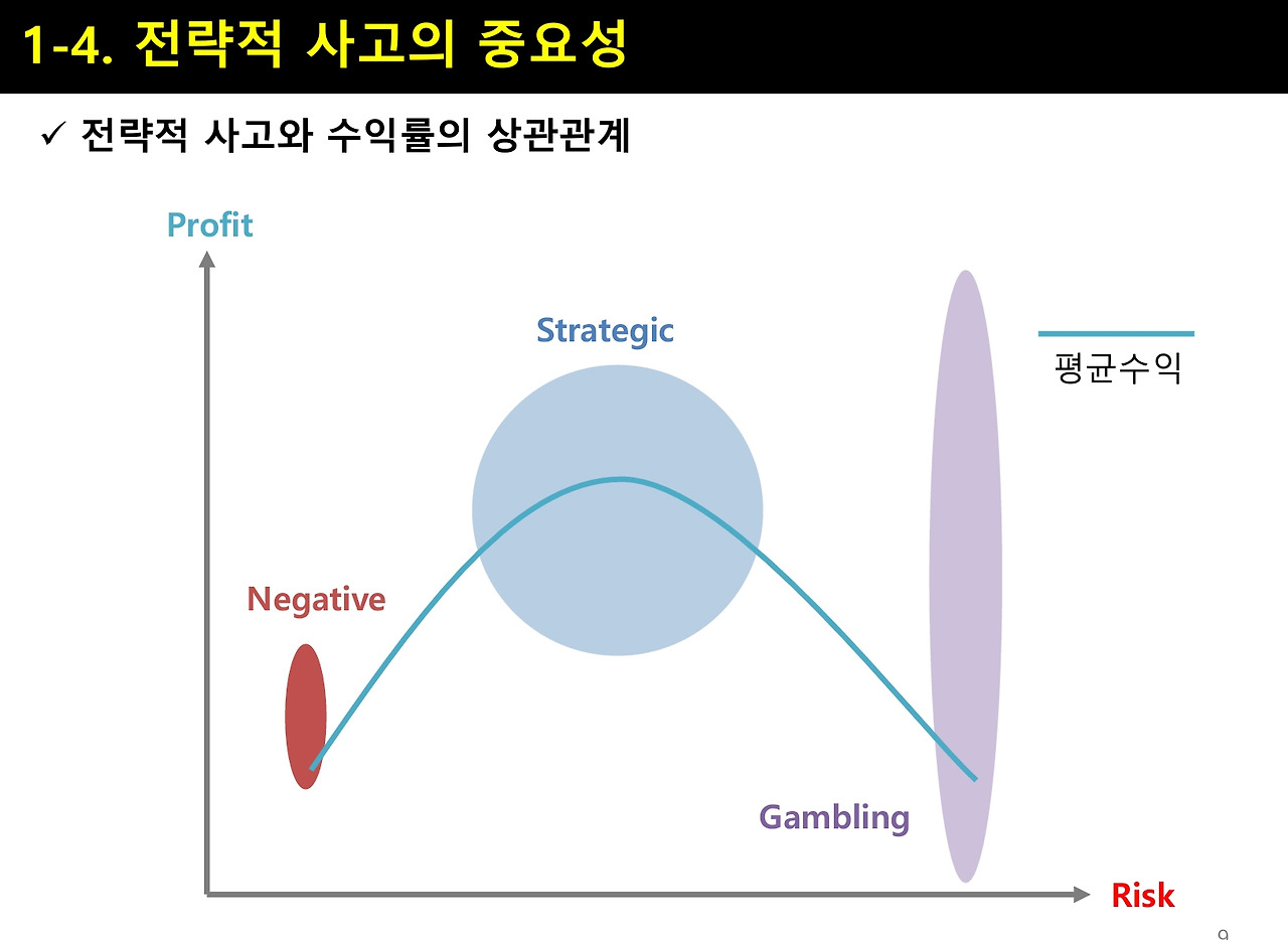 전략적 사고란 “시작과 끝을 알고 깃발을 향해 나아가는 방향성과 경로를 파악하는 일”라고 할 수 있습니다. 정리하자면, "1) 현 위치 파악 / 2) 최종 목표 설정 / 3) 단위 목표 설정 / 4) 목표 별 기간 설정 / 5) 목표 별 리소스 파악 / 6) 시나리오 플래닝(3개안<A.B.Z>수립) / 7) 세부 실행 계획 수립"으로 요약 할 수 있습니다. 핵심은 최상의 A를 계속 노리는 것보다, 중상의 B이상을 지속적으로 만들어 내며, 최악의 Z를 대비하는 것입니다. 전략이란, 대박을 내는 것보다, 최악을 면하며 어느 정도의 성과를 지속적으로 만들어 내는데 있습니다. 일상 생활 가운데서 ‘전략적 사고’를 습관화하여 비즈니스에 적용시켜 보세요~ 비즈니스의 정글에서 생존율을 높이고 , 꾸준히 성장하는데 도움이 될 것입니다!