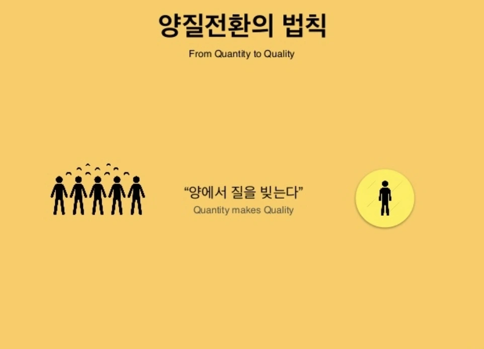 내가 신봉하는 법칙이 몇 가지 있는데, 그중 가장 큰 대원칙은 바로 <양질 전환의 법칙>이다. 이 법칙이 의미하는 바는 아주 간단하다. 일단 한 분야에 많은 in-put을 쌓으면, 그것이 퀄리티로 전환되어 고퀄의 out-put이 되어 나온다는 것이다. 한마디로 죽도록 많이 하면, 결국 잘하게 된다는 것이다.