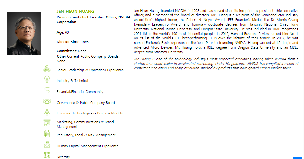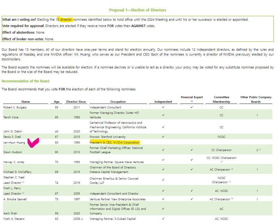 엔비디아의 CEO인 젠슨황이 표에 기입되어 있는 것을 확인하실 수 있죠? Proposal 1 - Election of Directors 목차에서 하위분류인 'Our Director Nominees'를 보면 젠슨황에 대한 자세한 설명을 추가로 확인할 수 있습니다.