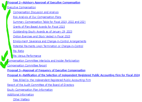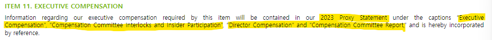 마찬가지로, 2023 Proxy Statement의 'Executive Compensation' 등을 참고하라고 나오니, Proxy Statement로 다시 이동해 보겠습니다.