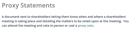 A. 주주들에게 회사의 중요한 결정에 참여할 수 있는 권리를 제공하는 중요한 문서입니다. 언제 어디서 주주 총회가 열리는지? 회의에서 투표될 사항들은 무엇인지? 그리고 회의에 직접 참석하여 투표하거나 위임장을 통해 다른 사람에게 투표를 위임하는 방법에 대해 다루고 있습니다. 따라서 주주들은 Proxy Statement를 주의 깊게 읽고 자신에게 중요한 사항에 대해 투표하는 것이 중요합니다. 아래 캡처는 SEC에서 제공하는 Proxy Statements에 대한 설명이니 참고해 주세요