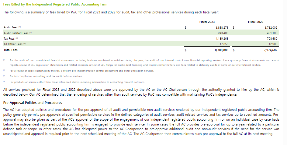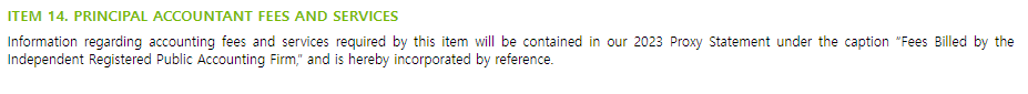Item 14는 기업들이 회계 기간 동안 다양한 서비스에 대해 회계법인에 지불한 수수료를 공개하도록 요구합니다. 이 정보는 실제로 10-K 양식에 포함되어야 하지만, 마찬가지로, Proxy Statement를 참고하라고 나옵니다.