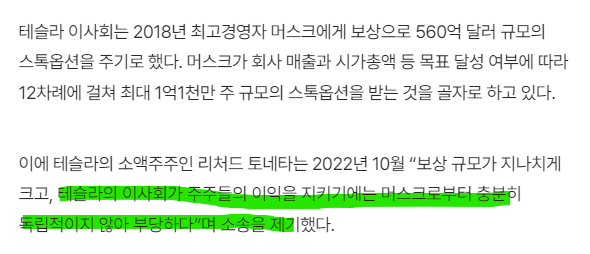 최근에 비화된 테슬라 CEO인 일론머스크의 스톡옵션 관련 기사를 봐도, 보상 방식과 규모가 적절한지에 대한 판단은 유보하더라도, 그 결정을 이사회가 독립적으로 공정하게 하지 않았다는 점이 비판을 받는 대목 중 하나이기 때문에, 이사회에 거는 일반적인 기대를 엿볼 수 있습니다.