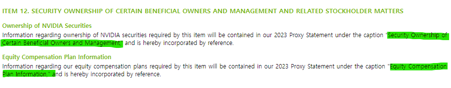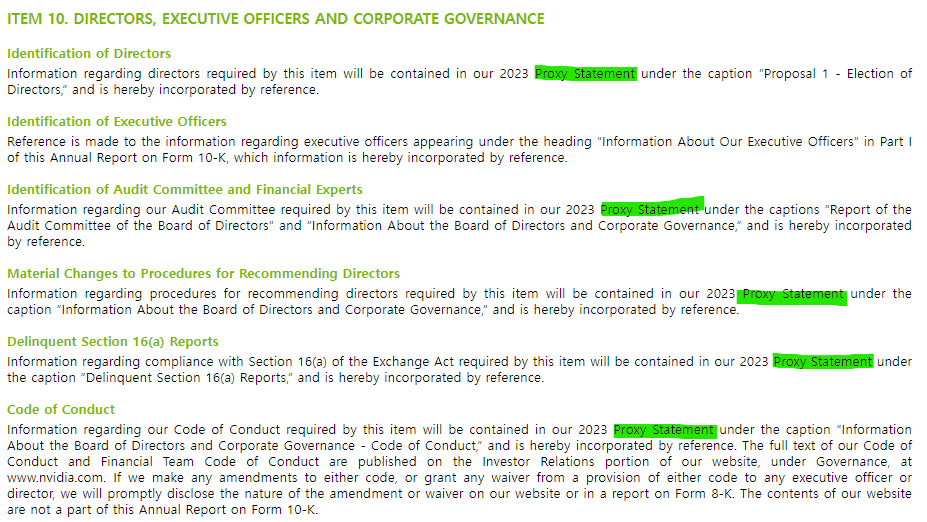 엔비디아의 ITEM10 내용은, 아래와 같이 대부분 10-K가 아닌, Proxy Statement를 참고하라고 나옵니다. 10-K에 내용을 중복해서 담기보다는, Proxy statement에 관련 정보를 더 적절히 담고 있으니 많으니 거기로 가서 보라는 거죠~!