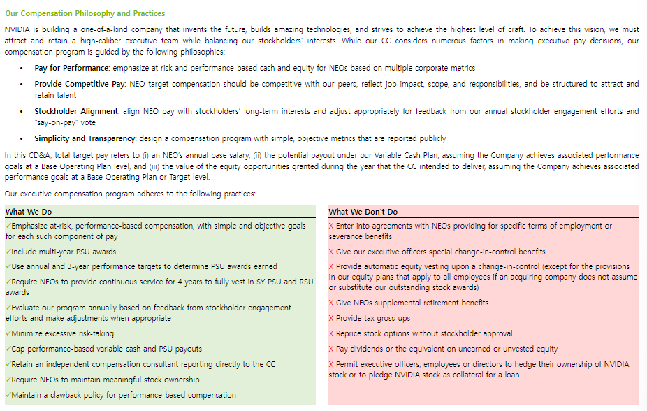 또 다른 한편으로는, 미국 상장사는 무언가... 굉장히 공정하고 합리적으로 보인다고 할까. 국내 상장사들도 임원의 보수에 대해 사업보고서상 명시하고 있지만, 투명성 면에서는 미국과 차이가 크다고 느낍니다. 특히 경영진에 대한 보상에 대한 철학과 원칙에 대해 서두에 명시하고 내용을 이어나가는 것이, 국내와는 정서적으로 다르게 느껴지는 부분이네요.. 물론 좋은 쪽으로요