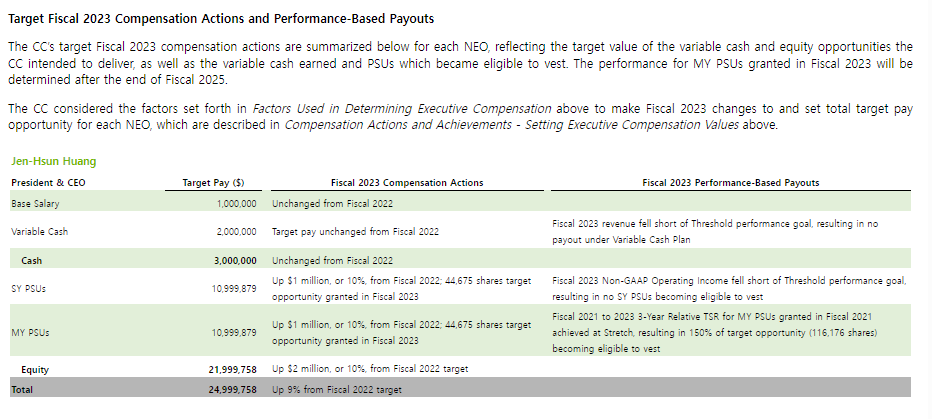 최근에 주가가 가파르게 상승하고 있어서 가지고 있는 지분 가치도 어마어마할 텐데, Base Salary 10억 달러, 성과급 20억 달러에 Equity관련 보상에 PSU도 어마어마하네요.