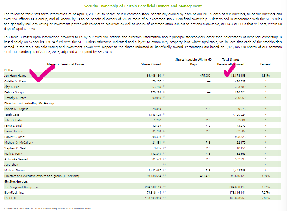 다시 본론으로 돌아와서, Security Ownership of Certain Beneficial Owners and Management로 이동해 보면 아래와 같이 경영진, 임원들의 지분율을 확인할 수 있습니다.