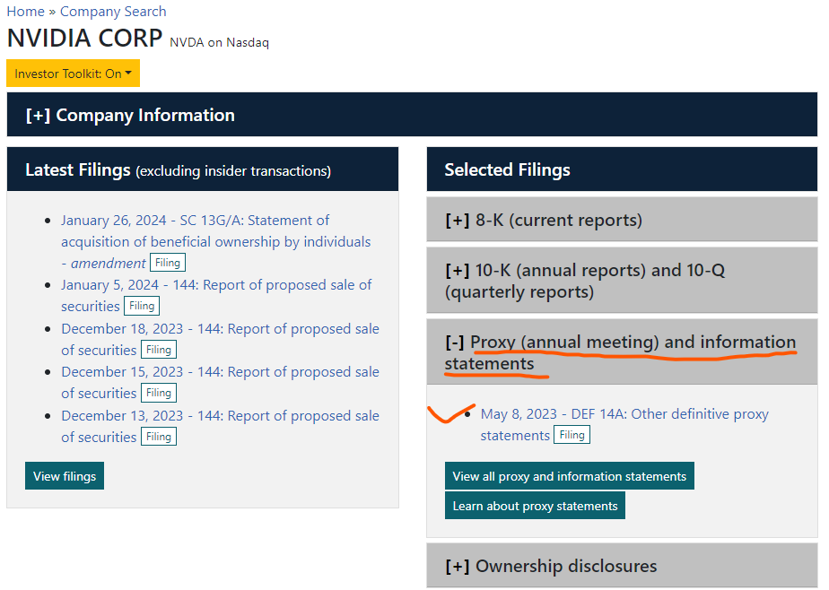 10-K 보고서는 이미 방대한 양의 정보를 포함하고 있으며, 모든 정보를 10-K 보고서에 포함하면 보고서가 지나치게 길어집니다. 참고로 엔비디아 기준 10–K 보고서는 90페이지, Proxy statement만 해도 70페이지에 달합니다.