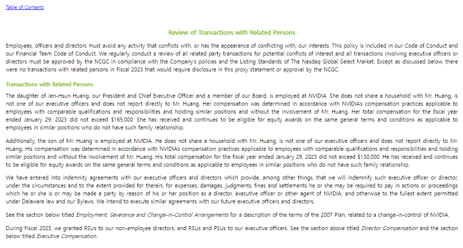 Huang 씨의 아들도 NVIDIA에 근무하고 있습니다. 그는 Huang 씨와 동일 가정에 거주하지 않으며, 임원 중 하나도 아니고 직접 Huang 씨에게 보고하지 않습니다. 그의 보상은 유사한 자격과 책임을 지닌 직원 및 유사한 직위를 보유한 직원에게 적용되는 NVIDIA의 보상 관행에 따라 Huang 씨의 참여 없이 결정되었습니다. 그의 2023년 1월 29일 종료된 회계 연도 총 보상 금액은 $130,000를 초과하지 않았습니다. 그는 유사한 직위를 가진 직원에게 적용되는 일반적인 약관과 조건에 따라 주식 수여를 받았으며 계속해서 받을 수 있습니다.