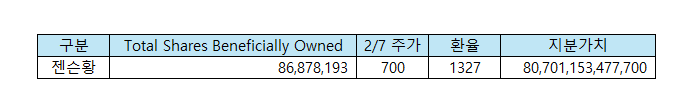 제가 단순하게 계산했을 때는 젠슨황 지분의 원화 가치가 80조가 넘네요. 액수가 너무 커서 별다른 감흥도 안 드네요. 앞으로도 번창하시길 바라겠습니다.