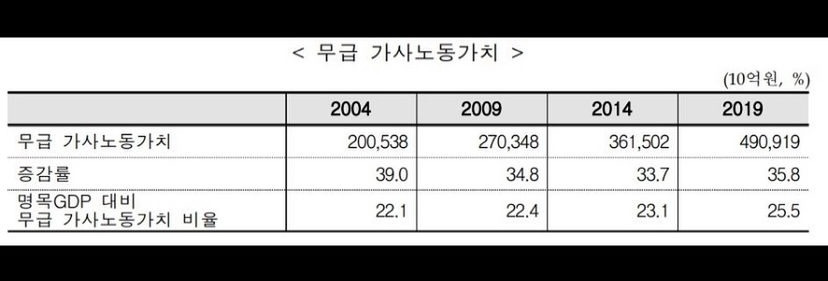한편, UN은 무보수로 이뤄지는 가정생산활동을 반영한 ‘가계생산계정’을 개발해 국민계정에 포함할 것을 각 국에 권장해 왔다. 이에 한국은 2021년 ‘무급 가사노동가치 평가’를 발표했으며, 가사노동의 경제적 가치를 490.9조 원으로 집계했다. 이는 명목 GDP 대비 25.5%에 달하는 수치다.
