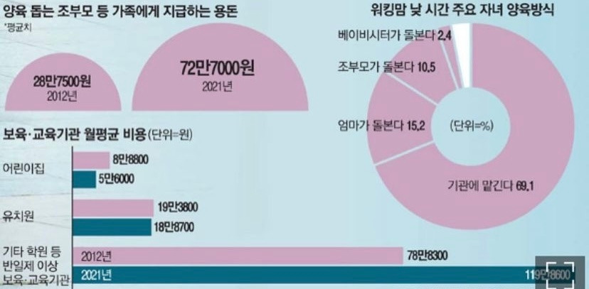 가사도우미 전문업체에서는 청소, 간병, 육아, 등하교, 김장, 출퇴근 등 세부적인 역할에 따라 가격을 책정하고 있으며, 입주 도우미는 월평균 350~400을 받는다. 결혼하고 아이를 낳아 키울 때, 남의 손 타는 걸 선호하지 않아 부모님이 봐주시는 것도 있지만 결국 비용이 높아서가 크다.(부모님 용돈은 평균 80만 원)